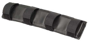 Synthetic leather with a gel lite impact absortion material, touch tape closure attaches to the bridle headpiece or noseband.